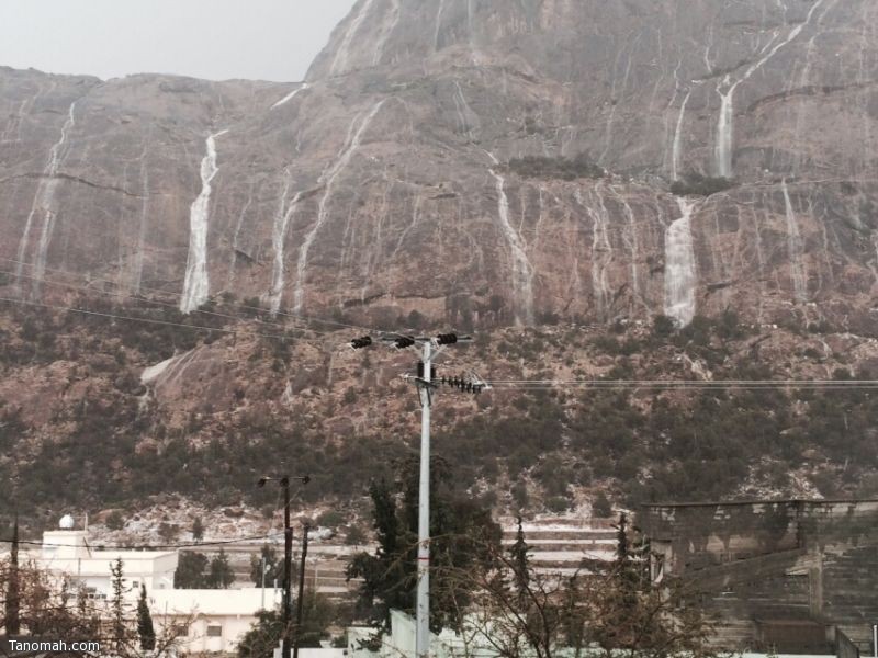 تنومة - سعيد القرش أكتسى معظم تنومة اليوم بحلة بيضاء بعد أن شهدت هطول أمطار غزيرة صاحبها زخات من البرد وتحولت على إثرها الجبال إلى شلالات منهمرة لساعات وقد سالت سال عدد من الأودية من أهمها وادي "المطعن"